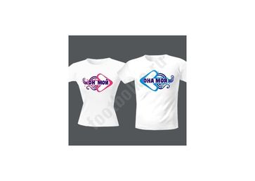 - Футболки для влюбленных "Он мой Она моя" по выгодной цене 1 350 р. руб.;