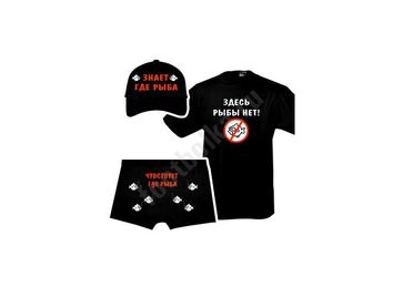 Набор рыбака - необычный подарок рыбаку! Футболка, трусы и бейсболка с прикольными надписями. Модель футболки на фото: Футболка мужская (классическая). Материал: джерси, хлопок 100%. Футболка без боковых швов. Плотность 150гр. Размеры S(46)-M(48)-L(50)-XL(52)-XXL(54)-XXXL(56) Трусы-боксеры мужские. Цвет черный. Размеры S(44)-M(46)-L(48)-XL(50)-XXL(52). Состав: 95% хлопок, 5% лайкра. Бейсболка 100% хлопок. Металическая застежка. Размер 56-59. None Есть доставка.