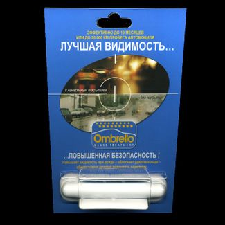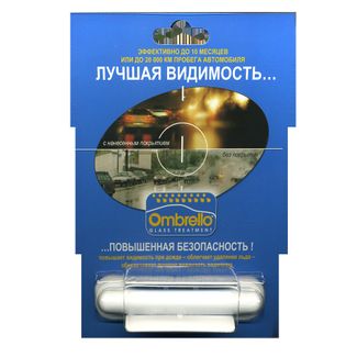 Антидождь Ombrello Glass Treatment - это единственное профессиональное нанопокрытие немецкого качества, защищающее автостекло от дождевых капель, жидкой грязи, снега, обледенения и органических останков насекомых. Специальный химический состав защитного покрытия сохраняет свой свойства до 10 месяцев (или 20000 км пробега) после однократного использования. Одной капсулы Ombrello хватает на обработку 1 лобового и 2-х боковых стекол. Антидождь Ombrello предназначено для нанесения на поверхности лобового, заднего и боковых стекол автомобиля. Обработанное стекло приобретает превосходные характеристики - водооталкивание и очищение при воздействии воздушного потока. Нанопокрытие Ombrello гарантирует превосходную защиту и чистоту стекол автомобиля в любых погодных условиях. Химический состав антидождя повышает эффективность и долговечность как стеклоочистителей (дворников), так и самого лобового стекла. При скорости более 70 км/ч отпадает необходимость использования дворников. Во время долгой стоянки автомобиля с нанесенным на стекла нанопокрытием «Ombrello» облегчается удаление снега и наледи. Достаточно единожды использовать комплект Ombrello для обработки ветрового и других стекол машины, и покрытие будет действовать до 10 месяцев - отталкивать дождь и снег, предотвращать намерзание льда и образование следов от насекомых . Стеклоочистители при этом подвергаются меньшему износу, а блики сводятся к минимуму. При повторной обработке данным защитным средством нужно просто очистить стекла и заново нанести Антидождь Ombrello Glass Treatment. Антидож