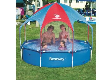 Каркасный бассейн 56193, 244 х 51 см. Детский сборный бассейн на металлическом каркасе быстро и легко устанавливается. Процесс сборки бассейна до наполнения водой занимает 10 минут. Бассейн изготовлен из трехслойного ПВХ синего цвета. Прочность бассейна обуславливается его стальным каркасом, благодаря которому бассейн выдерживает большие нагрузки, в нем одновременно могут купаться несколько детей. Особенность этого бассейна в съемном тенте от солнца, в центральную часть которого встроен фонтан, подключаемый к садовому шлангу. Диаметр бассейна: 244 см. Высота бассейна: 51 см. Объем: 1688 л. Вес упаковки: 16.3 кг. None