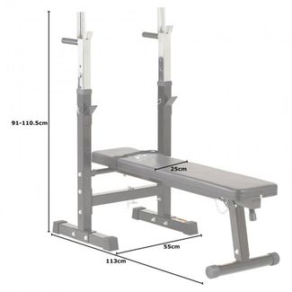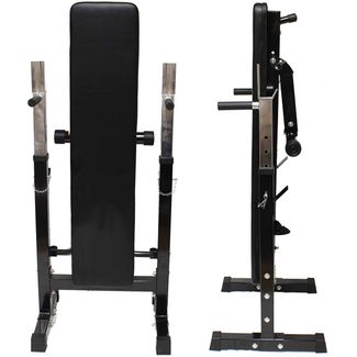 Скамья силовая со стойками под штангу. Предназначена для выполнения различных упражнений: жим штанги лежа, отжимания на брусьях и другие. Стойки тренажера регулируются по вы None