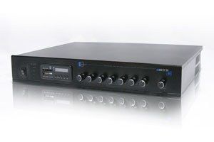 Микшеры-усилители CVGaudio MTR-60 - новый формат 100V Public Address усилителя для систем фонового звука в торговых и общественных помещениях. Он имеет настольное исполнение, современный аккуратный дизайн, что выгодно отличает эту модель от других подобных 100V устройств, продуманную эргономику и качественное, плотное звучание. Помимо традиционных для подобных усилителей линейных и микрофонных входов MTR-60 имеет встроенный модуль MP3 плеера и FM тюнера. Плеер может проигрывать mp3 файлы с USB флешки или SDcard. FM тюнер имеет память на 20 станций и возможность подключения внешней антенны для более уверенного приема радиотрансляции. Модуль плеера и тюнера может управляться с дистанционного IR пульта, входящего в комплект поставки. Также, как было написано выше, к усилителю можно подключить два источника линейного сигнала (CD, DVD, MP3 плеер, компьютер, ноутбук, планшет и так далее) и два микрофона. Первый микрофонный вход приоритетный и наличие сигнала на нем заглушает все остальные линейные и микрофонные входящие сигналы, а также сигнал с встроенного MP3/FM модуля. Линейные входа усилителя выполнены на разъемах 2RCA, микрофонные входа - TRS 6,3mm Jack (не балансный). Каждый вход имеет индивидуальную настройку громкости, также аналогичный регулятор имеет встроенный модуль MP3/FM. Помимо этого для плавного управления суммарной громкостью воспроизведения имеется общий регулятор Master. Также в данной моделе усилителя предусмотрен двухполосный эквалайзер. Все выше описанные органы управления MTR-60 располагаются на лицевой панеле устройства. Входа и выхода располагаются на задней панеле. Также сзади располагается удобный самозажимной клеммный терминал для подключения громкоговорителей. Усилитель может работать как с 100V/70V трансформаторными акустическими системами, так и с низкоомными, суммарное сопротивление которых находится внутри диапазона 4-16ohm (монофоничекое подключение - 1 канал). Одновременно подключать и 100V и 4-16ohm акустические системы к MTR-6