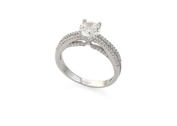 Помолвочное кольцо с фианитами алмазной огранки изготовлено из серебра 925 пробы.