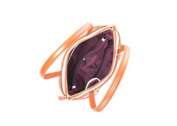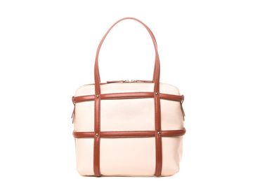 Квадратная сумка бежевого цвета с коричневыми ручками из натуральной кожи.