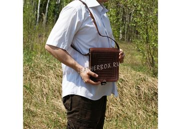 Сумка-планшет для документов. Натуральная коровья кожа, ручная работа. Производство Марокко. Модель уни-секс. Подходит как для мужчин в качестве барсетки, так и для женщин, как нагрудная сумка- документница. Как и предыдущие модели, украшена ажурным выбитым орнаментом. Сумка имеет один большой внутренний отдел и карман на молнии для мелких предметов.