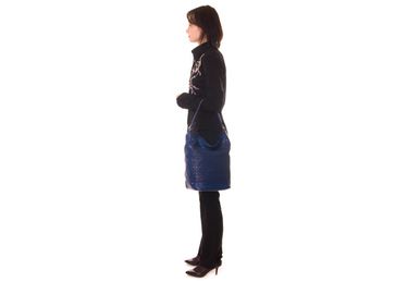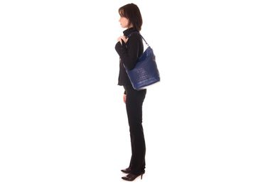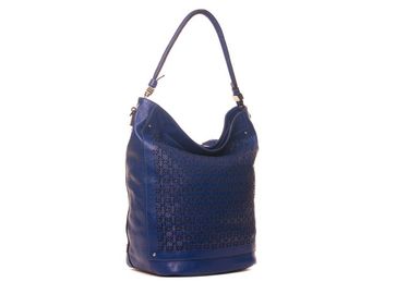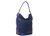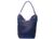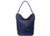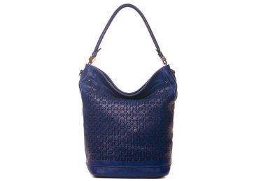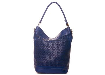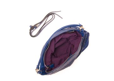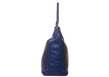 Вместительная сумка-мешок из натуральной кожи синего цвета. Длинный ремень позволяет носить сумку через плечо.