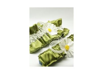 Свадебные подвязки - часть комплекта. Сделаны из атласа травяного цвета, украшены очаровательными ромашками, сердцевина цветка сделана из желтого бисера.