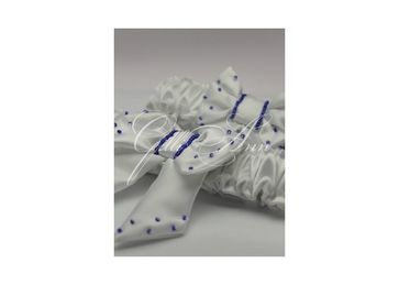 Свадебные подвязки, сделанные из белого атласа, декорированные синими бусинками на банте.