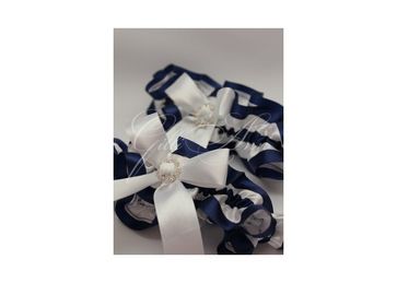 Свадебные подвязки - часть комплекта. Сделаны из сочетания белого и синего атласа. Украшены белым бантом с круглой брошью, усыпанной стразами.