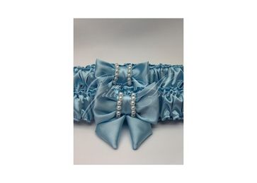 Комплект свадебных подвязок, сделанных из голубого атласа. Декорированы пышным бантом и жемчугом, напоминают о морской прохладе в летний день.