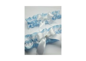 Свадебные подвязки, сделанные из атласа белого и голубого цветов. Украшены бантом и жемчугом.