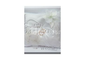 Свадебная подушечка сделана из белого атласа. Декор из бабочек, бусин под жемчуг, и цветка орхидеи. Материал и декор: тафта (атлас), органза, бабочки, цветок орхидеи, перья марабу, стразы Сваровски, бусины под жемчуг, контуры по ткани, атласные ленты. None