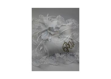 Свадебная подушечка для колец Gilliann Beauty PIL174 Подушечка для обручальных колец сделана из белого атласа, по краям вшиты пышные кружевные оборки. Украшена большим красивым цветком, жемчугом, вышитыми золотыми инициалами жениха и невесты. Материалы и декор: атлас, кружево, декоративные элементы, жемчуг. None