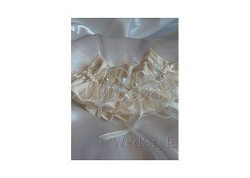 Свадебная подвязка сделана из атласа цвета айвори, украшена атласными лентами, жемчугом.