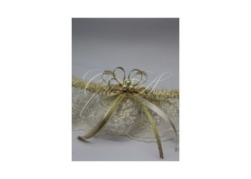 Свадебная подвязка выполнена из прозрачного кружева. Декорирована узкими атласными золотыми лентами, собранными в цветок с тремя большими бусинами в центре.