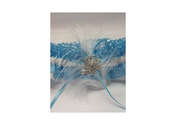 Свадебная подвязка, сделанная из сочетания белого атласа с голубым прозрачным кружевом. Декорирована красивой брошью в форме цветка со стразами.