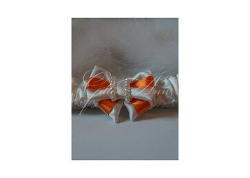 Свадебная подвязка, сделанная из атласа цвета айвори. Декорирована ярким бантом с жемчугом, отделка из оранжевого атласа придает непринужденность.