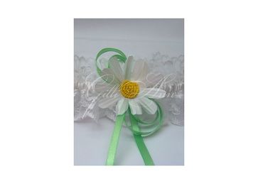 Свадебная подвязка, сделанная из белого прозрачного кружева. Украшена ромашкой с соцветием в центре из желтого бисера. Атласные ленточки зеленого цвета напоминают стебли.