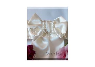 Свадебная подвязка сделана из атласа. Декор из атласного банта, украшенного искусственным жемчугом.