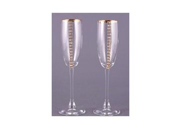 Свадебные бокалы GLS048 c золотой каймой - набор из 2 шт., 170 мл. Свадебные бокалы для шампанского с золотой каймой и стразами. В комплект свадебных бокалов входит коробка. Материал: стекло, стразы. None