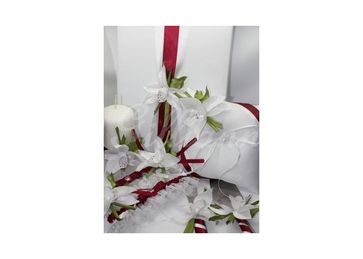 Свадебный комплект Gilliann Spring Flower SET024. Комплект включает в себя альбом пожеланий, папку для свидетельства, комплект подвязок, подушечку, комплект бутоньерок, свечи, набор для торта (нож и лопатку для торта). Выполнен в белом атласе с характерными декоративными элементами. Материалы и декор: атлас, атласные ленты, декоративные элементы, жемчужины. None