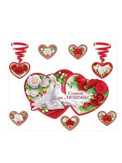 Набор на скотче "Совет да любовь!" (GKOP 69.389) STA845 Красочный набор для украшения банкетного зала. В набор входят пять сердечек на скотче, два сердечка на спиральках и два больших спаренных сердца как одно целое. Все сердечки окаймлены красной полосой, украшены розами. Очень яркие, сочные, они внесут оживление в праздничный интерьер. Мин. заказ 500 руб.