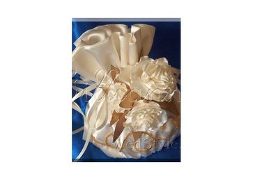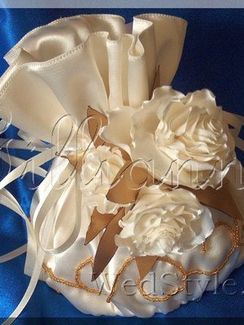 Свадебная сумочка Gilliann Белое золото BAG285 Атласная сумочка цвета айвори в стиле мадам Помпадур. В центре декор из роз цвета айвори и листьев золотого цвета. Низ сумочки вышивка чешским бисером. Отдельно ручки и отдельно ручки-утяжки. Все ручки сделаны из атласных лент. Жёсткое дно сумочки не даёт ей терять форму. Сумочка украсит по достоинству любую невесту Материалы и декор: свадебный атлас, атласные ленты, чешский бисер, жемчужины, розы из атласа. Размеры: любые. None
