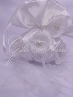 Небольшая сумочка Fine в стиле мадам Помпадур позволит невесте спрятать разные мелочи - носовой платок, зеркальце, косметику. Сделана из белоснежного атласа, украшена белыми цветками с распустившимся соцветием, с жемчужинами в сердцевине. Затягивается атласными лентами, ленты же создают ручку-утяжку. Сохранить форму помогает жесткое дно. Сумочка прекрасно подойдет к белому наряду невесты, украшенному жемчугом
