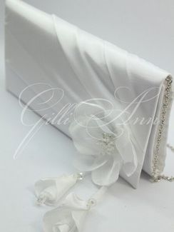 Свадебная сумочка клатч Gilliann Annette BAG296 Сумочка клатч Annette - классическая сумочка, которую выбирает большинство невест под белоснежный богато декорированный наряд. Сделана из белого атласа с драпировкой, украшена восхитительным соцветием розы со стразами. Необычная деталь - внизу цветка прикреплены два цветка в форме нераспустившихся бутонов роз. Возможно они олицетворяют еще не раскрывшееся пламя любви, которое придет с началом семейной жизни.