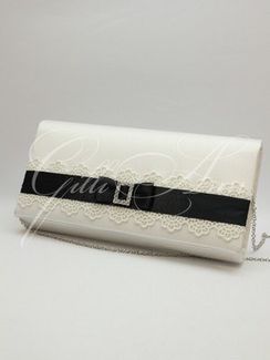 Свадебная сумочка клатч Gilliann Night Magic BAG303 Стильный клатч для невесты, которая отдает предпочтение безупречной классике и аристократической элегантности. Сумочка покрыта белым атласом и украшена композицией в стиле коллекции Gilliann Night Magic: основание из белого кружева покрыто черной атласной лентой со строгим бантиком и декоративным элементом со стразами. Ручка клатча выполнена в виде серебряной цепочки. Безупречно-черная лента на белоснежном атласе - поистине красиво сочетание, которое объединяет в себе идеальную чистоту и завораживающую магию. Строгая геометрия декора смотрится очень эффектно, а вместительный внутренний отдел позволяет хранить в сумочке множество полезных аксессуаров, которые могут пригодится невесте. Материалы и декор: атлас, атласная лента, декоративная ручка, декоративный элемент со стразами. Размеры: любые. Цвет: белый (возможно бесплатное изменение на другой цвет) None