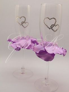 Свадебные бокалы со стразами Сваровски Gilliann Nectaria Flower GLS098 - набор из 2 шт. Свадебные бокалы для шампанского Gilliann Nectaria Flower GLS098 - один из предметов коллекции. На стекло нанесены стразами два переплетающихся сердечка, на ножке у самого дна бокала - большое соцветие с раскрытыми лепестками сиреневого цвета. Каждый лепесток украшен большой прозрачной бусиной. Цветок словно служит фоном, когда шампанское будет играть пенящимися пузырьками в свете огней. Материал: стеклянные бокалы, декоративные элементы, бусины, стразы. None
