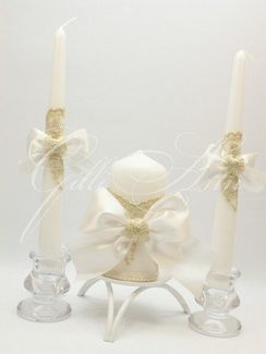 Набор Свечи Домашний очаг Gilliann Royal Luxury CAN076 Стильные и изысканные свадебные свечи Gilliann Royal Luxury станут прекрасным украшением церемонии зажигания домашнего очага. Свечи декорированы тончайшим фатином с золотой вышивкой и атласными бантами. Золотые узоры придают свечам благородный и элегантный вид. В набор входят три свечи - две длинные и одна большая. Церемония передачи и зажигания домашнего очага - заключительная часть свадебного банкета. Домашний очаг символизирует тепло, уют и покой в тихой домашней гавани, семейное благополучие и счастье. Поджигая очаг молодой семьи, родители делятся с молодоженами бесценным опытом счастливой семейной жизни. Материалы и декор: свечи, атласные ленты, фатин, вышивка, декоративная окантовка. None