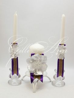 Набор свечей Семейный очаг Gilliann Valencia Gold CAN083 Набор Gilliann Valencia Gold состоит из трех украшенных свечей для проведения церемонии поджигания домашнего очага. Так как издревле хранительницей семейного очага является женщина, в церемонии обычно принимают участие мать жениха, мать невесты и сама невеста. Для родителей оптимально подойдут длинные и высокие свечи, так как ими наиболее удобно поджигать свечу невесты. Главная свеча, которая символизирует домашний очаг молодой семьи, должна быть наряднее и крупнее двух других. Свечи Gilliann Valencia Gold декорированы яркими фиолетовыми и золотыми лентами, а также белоснежными цветами со множеством хрустальных бусин внутри. Такой элегантный и роскошный набор украсит свадьбу с золотыми и фиолетовыми акцентами, а также может быть использован для церемонии в классическом стиле. Материалы и декор: свечи, атласные ленты, цветы, органза, хрустальные бусинки. None