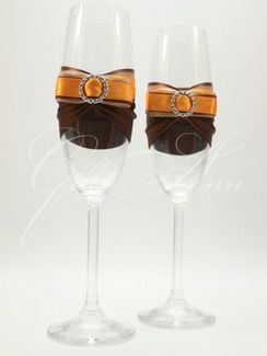 Свадебные бокалы Gilliann Chocco Beauty Orange GLS108 - набор из 2 шт. Что может быть вкуснее шоколада и апельсина? Приятная свежесть, сладость, тающая во рту - вот такие ассоциации могут вызвать такие "вкусные" бокалы, украшенные оранжево-коричневой атласной двусторонней лентой. Шампанское из них будет просто божественным напитком для молодоженов. Материал: богемское стекло, атласные ленты, стразы. None
