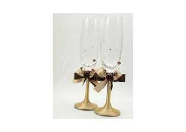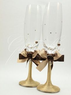 Свадебные бокалы со стразами Сваровски Gilliann Amore Caffa GLS118 - набор из 2 шт. Ножки и основание бокалов плотно обтянуто лентой кремового цвета, создавая рельефную поверхность. Вверху ножки - двухцветный атласный бант и коричневые бусинки на проволоке. Стекло украшено стразами. Оригинальный и стильный декор бокалов из коллекции Amore Caffa по достоинству оценят молодожены. Материал: богемское стекло, атласные ленты, стразы, бусины. None