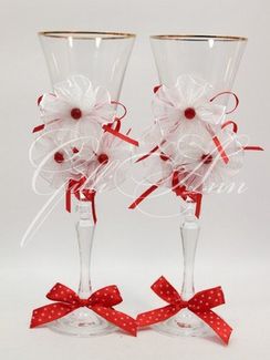 Свадебные фужеры для шампанского Gilliann Red Retro GLS152 Нарядные фужеры в руках молодоженов преображают свадебные фотографии и удачно передают торжественную атмосферу. Набор из двух бокалов для шампанского Gilliann Red Retro не только украсит счастливые мгновения, но удачно поддержит тематику ретро-свадьбы. В качестве основы используются бокалы в форме колокольчика с фигурной ножной и золотой каймой. Основание бокала декорировано бантиком из красной атласной ленты в белый горошек. Бокалы украшены цветочными композициями из пышного фатина, тонких красных ленточек и хрустальных бусин. Смелые и яркие бокалы органично перекликаются с торжественным и красочным антуражем ретро-свадьбы. Материалы и декор: стекло, атласные ленты, фатин, хрустальные бусины. Базовые цвета: молочный, красный (возможно бесплатное изменение на другие цвета). None