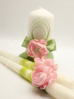 Свечи домашний очаг Provance Garden CAN055 Свечи из коллекции Provance Garden. Прекрасно подойдут для летней свадьбы, особенно если церемония проходит на природе, в окружении благоухающей природы и щебечущих птиц. Они напоминают летний сад, настолько сделаны мастерски. Каждую свечу украшает розовая роза с соцветием, из бусин, лента из органзы светло-зеленого цвета опоясывает крест-накрест, напоминая стебли и листья цветка. Главную свечу - толстую - украшает бант из атласной ленты зеленого цвета, подчеркивая ее важность в церемонии зажжения домашнего очага. Яркие, веселые свечи радуют глаза, поднимают настроение и украсят торжество, наполняя его беззаботностью, романтичностью. Материалы и декор: свечи, атласные ленты, органза, декоративные элементы, бусины. None