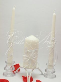 Свечи домашний очаг Isabella CAN053 Свечи - неотъемлемая часть свадебной церемонии. Нет лучшего аксессуара для придания романтики, загадочности, таинственности. Подбирать их нужно в соответствии со стилистикой свадьбы. Свечи из коллекции Isabella - отличный выбор для классической свадьбы, оформленной в светлых тонах. Сделаны из воска кремового цвета, украшены кружевом, лентами, жемчугом. Большую свечу молодожены могут использовать в первом танце, держа ее вдвоем, как символ единения влюбленных сердец. Материалы и декор: свечи, атласные ленты, кружево, жемчуг. None