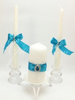 Свечи семейный очаг Gilliann Sea Diamond набор из 3 свечей CAN072 Набор из трех элегантных свадебных свечей. Свечи декорированы белоснежным кружевом, украшены бантами из атласных лент ярко-голубого цвета. Высокие свечи украшены небольшими стразовыми элементами, а широкая брошью из крупного голубого кристалла, окруженного сверкающими стразами. Изысканное сочетание кружева и камней придает комплекту истинно королевский шарм. Набор отлично впишется в классическую и кружевную свадьбу. Трогательная и прекрасная церемония "Домашний очаг" способствует единению двух семей и укреплению брачного союза молодоженов. Семейный очаг символизирует домашнее тепло, доверие и счастье, которым родители спешат поделиться с новоиспеченными супругами. Материалы и декор: свечи, стразовые элементы, атласные ленты, кружево. None