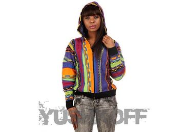 Свитер женский разноцветной окраски с молнией и капюшоном.