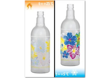 На поверхность бутылки с помощью специальных красок наносится печать элементов дизайна, которые после охлаждения меняют цвет и становятся более яркими и контрастными. Это преимущество позволяет привлечь внимание к приоритетным элементам декора, и, наряду с возможностью подбора различных цветов, способствует реализации любых дизайнерских идей. Температура, при которой меняется цвет нанесенных элементов, может определяться заказчиком.