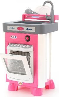- посудомоечную машину со звуковыми эффектами. Реалистичность работы данного игрового элемента достигается за счет специального резервуара для воды, расположенного в дверке посудомоечной машины. После включения игрушки, вода разбрызгивается между двумя прозрачными стенками дверки и создается эффект реальной работы, а игрушечная посуда остается сухой.