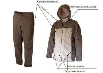 Куртка и брюки выполнены из двухслойного флиса плотностью 320 г/м. Куртка застегивается при помощи застежки молнии, снабжена анатомическим отстегивающимся капюшоном. Высокий воротник стойка. В куртке семь карманов, два боковых...
