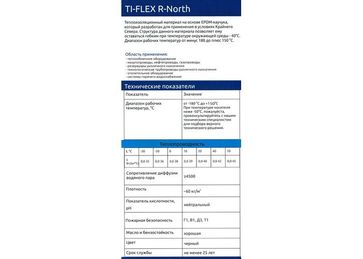TI-FLEX R-North - теплоизоляционный материал на основе EPDM-каучука, который разработан для применения в условиях Крайнего Севера. Структура данного материала позволяет ему оставаться гибким при температуре окружающей среды - 40 °C.