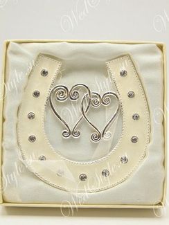 Фигурка для украшения торта "Белая подкова" ST1156 Оригинальная фигурка для украшения торта - белая подкова, декорированная крупными сверкающими стразами. Упакована в картонную подарочную коробку. Внутри подковы переплетены два завитых серебряных сердечка. Подкова с давних времен считается символом счастья и благополучия. Такая фигурка будет оберегать любовь молодоженов. Упаковка: подарочная коробочка Материал: металл, стразы None