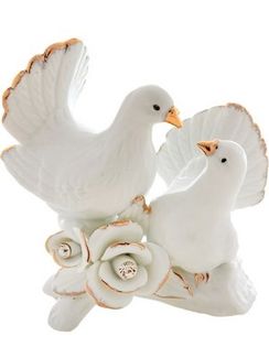 Сувенир под фарфор "Любовь голубков" со стразами (SL-535812) K010669 Очаровательная парочка белых голубков нежно смотрят друг на друга, смотреть на них – одно удовольствие, всем своим видом птички показывают, как хорошо им быть вместе. Сувенир под фарфор "Любовь голубков" со стразами выполнен из высококачественной керамики, покрыт белоснежной глазурью, превосходно украшен золотистой краской. У основания фигурки – букет из мелких роз, стильно украшен крупными стразами. Этот свадебный атрибут превосходно смотрится, может служить, как украшением свадебного торта, так и символическим знаком в праздничном интерьере. Так же его применяют для награждения молодоженов в различных конкурсах и викторинах, которые проводят во второй части брачной церемонии. Материал : керамика Размеры: 6х12х11,5 см Мин. заказ 500 руб.