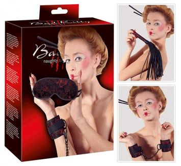 БДСМ-набор из трех предметов Asia-Erotik-Set: наручники, плеть и маска на глаза из кружев. В комплекте:наручники, плеть и маска на глаза. None