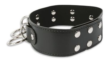 Вам нравится превосходство над партнером? Проследите, чтобы он имел надлежащий вид, который он мог бы продемонстрировать своему Хозяину! <br><br> Ошейник – неотъемлемый атрибут ролевой игры. Средний ошейник с заклёпками и кольцами – это еще и брутальный девайс для самых раскованных.<br><br> Ошейник изготовлен из кожзаменителя, подшит по краям и декорирован 5 парами хромированных колец и заклёпок. По размеру регулируется тремя рядами кнопок. Ширина - 4 см.<br> Максимальный обхват - 44 см., минимальный - 39 см. None