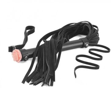 Плеть изготовлена из натуральной велюровой кожи. Торец металлической рукояти украшена акриловой розой. Количество лент в хвосте 25-26. Длина рукояти - 17 см. None