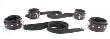 Набор для связывания состоит из наручников и оков, выполненных из натуральной черной кожи с контрастной красной строчкой, декорированных холнитенами, и двух бондажных ремней с карабинами. Длина ремней регулируется от 110 до 220 см. Аксессуары фиксируются на теле при помощи ремней и металлических пряжек. Наручники подойдут на обхват руки от 15 до 25 см, оковы подойдут на обхват от 16 до 27 см. Не ограничивай себя во власти или получай удовольствие от сладких ограничений! Ширина ремней - 2 см.<br> Ширина оков и наручников - 5 см. None